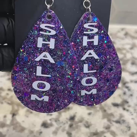 Purple Glitter Shalom Pre-Made Hand Crafted Tear Drop Earrings